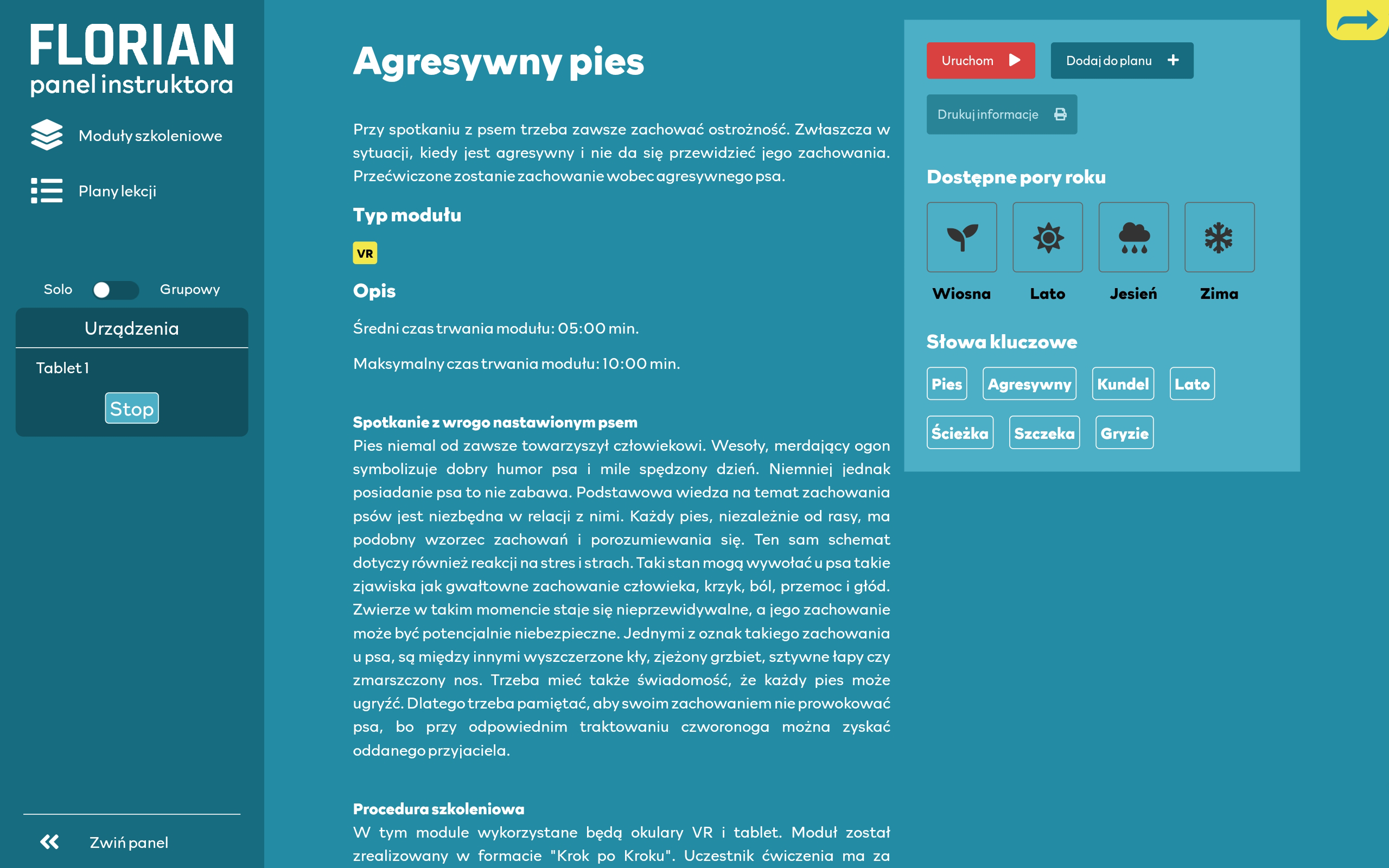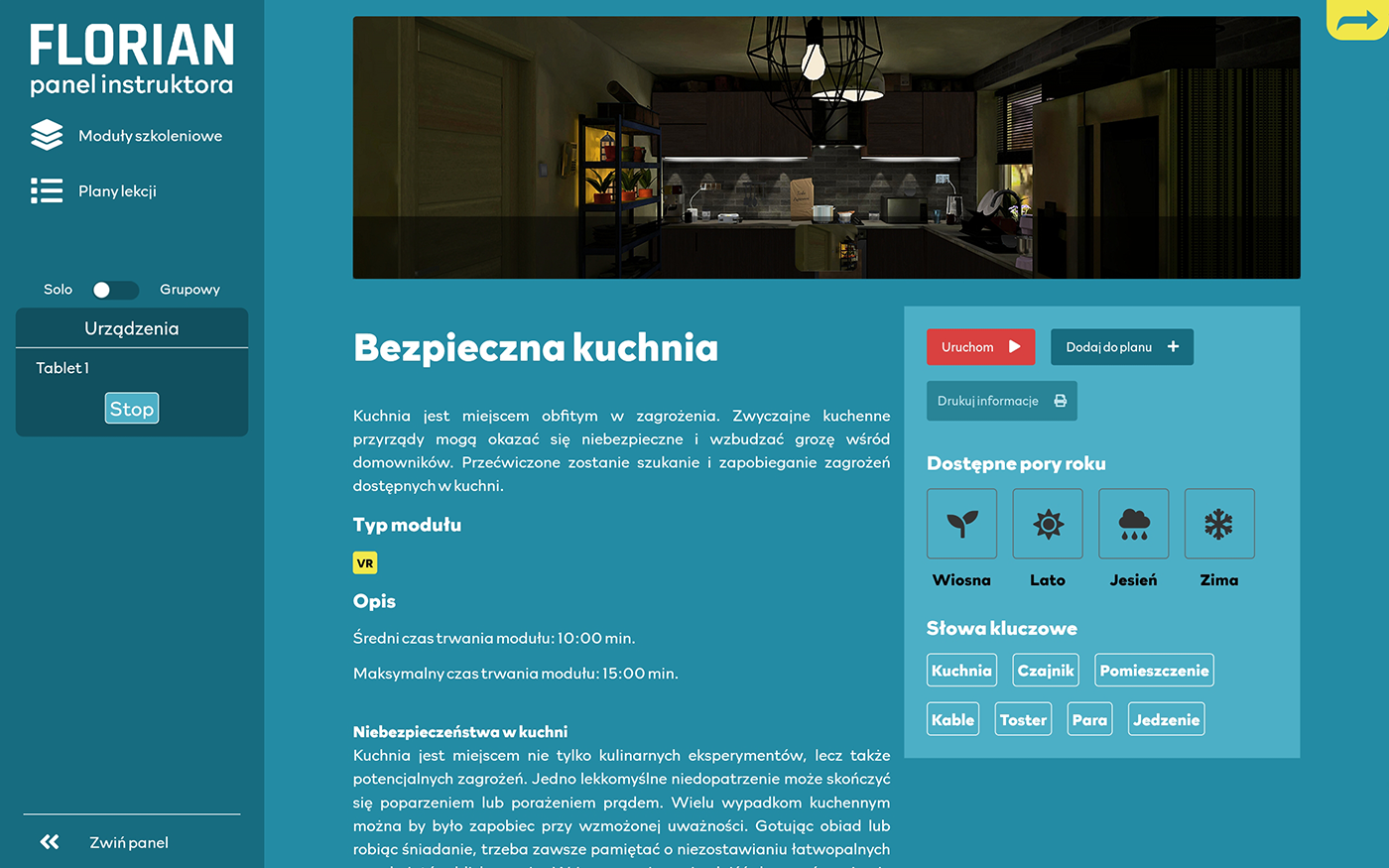 Do ćwiczenia ze scenariuszami przewidzianymi we Florianie wykorzystywane są gogle VR wraz z kontrolerami, dwa tablety oraz skrzynia – mieszcząca serce systemu. Za ich pomocą uczestnik lub uczestnicy szkoleń przenoszą się do cyfrowej rzeczywistości, gdzie w formie krótkich zadań wchodzą w interakcję z wirtualnym światem. Mogą to zrobić w dwóch trybach rozgrywki: jednoosobowym lub grupowym.